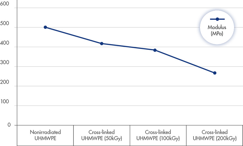 Modulus (defined as the ratio of tensile stress to tensile strain) for non-irradiated and cross-linked polyethylene. Subsequent melt stabilisation for cross-linked polyethylene was performed at 170°C. Adapted from Baker et al. [3].