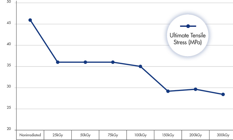 Ultimate tensile strength (MPa) for non-irradiated and cross-linked polyethylene. Subsequent melt stabilisation for cross-linked polyethylene was performed at 150°C. Adapted from Muratoglu et al. [4].