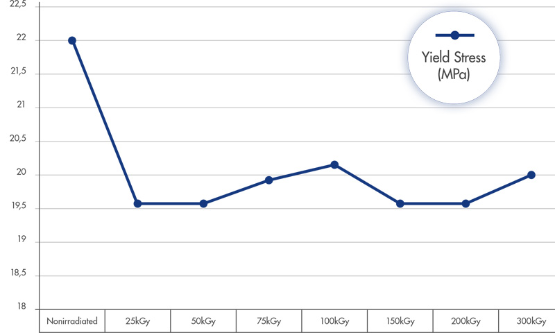 Yield stress (MPa) for non-irradiated and cross-linked polyethylene. Subsequent melt stabilisation for cross-linked polyethylene was performed at 150°C. Adapted from Muratoglu et al. [4].