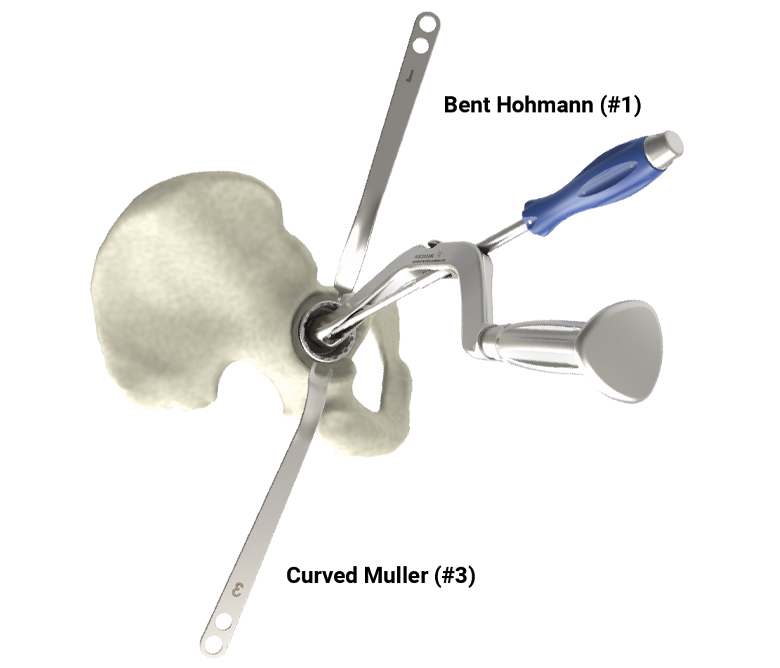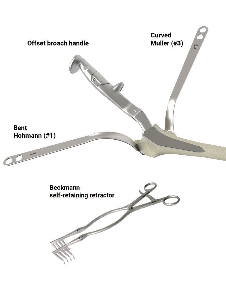 Consistently smooth and gently shaped retractors combined with offset instruments (broach handle, reamer handle, cup impactor) specifically designed to help avoid soft tissue damage.