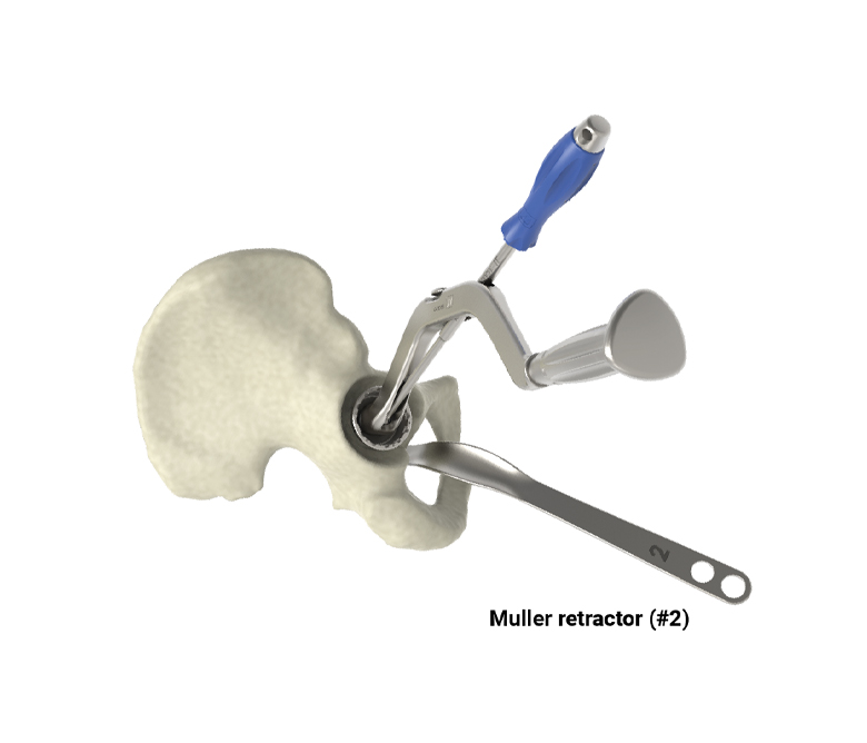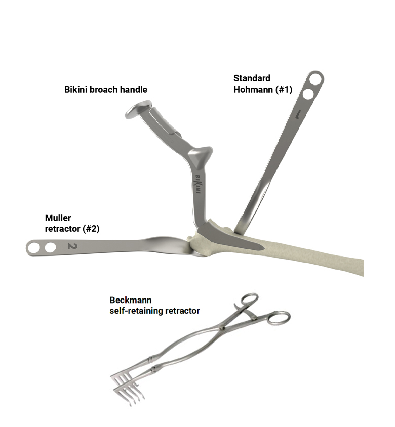 Consistently smooth and gently shaped retractors combined with offset instruments (broach handle, reamer handle, cup impactor) specifically designed to help avoid soft tissue damage.