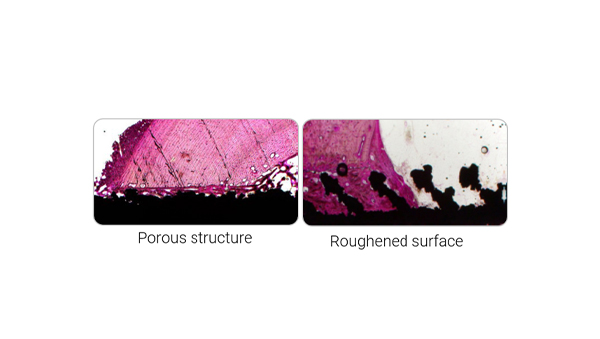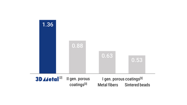 3D Metal enables the design and manufacture of implants with a high coefficient of friction (μ), enhancing grip at the bone interface and providing superior primary stability[3,4]. Additionally, key parameters of the 3D Metal’s porous structure, such as pore size and porosity, can be precisely designed and controlled. These factors are essential for achieving an efficient biological fixation[5]. The efficient connection with the bone has been validated through an animal study[4].