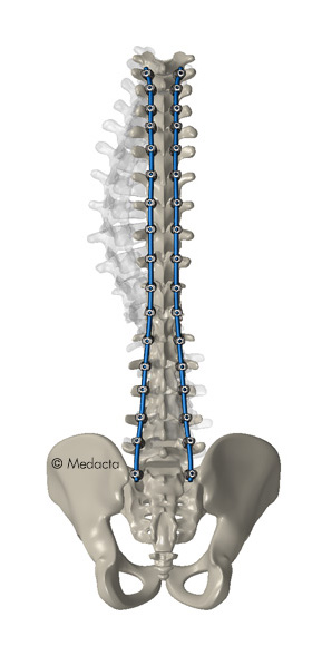 The goals of surgical treatment are to obtain curve correction and to prevent curve progression by fusing the spine at the optimum degree of safe correction of the deformity. This is generally achieved by placing metal implants onto the spine that are then attached to rods, which correct the spine curvature and holds it in the corrected position until fusion (knitting of the spine elements) occurs.